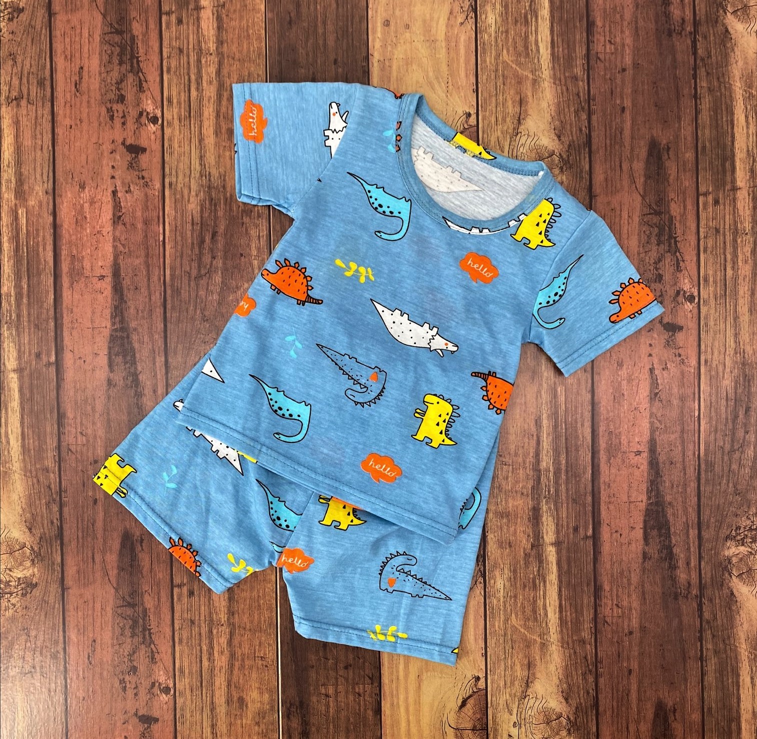 青空や海を思わせるような水色に3種類のゆるかわいくデフォルメされた恐竜ちゃんたちがデザインされたパジャマです。