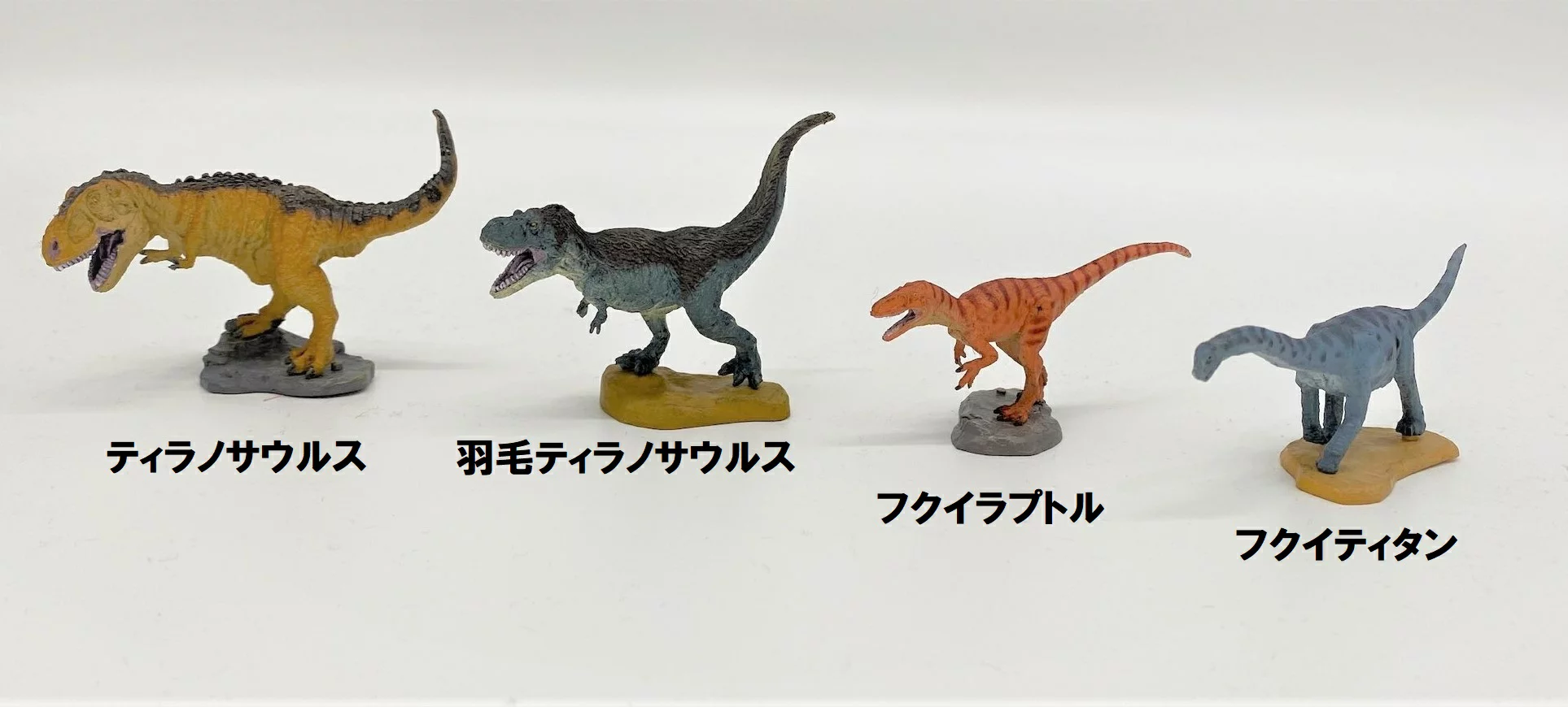 人気のティラノサウルス・羽毛ティラノサウルス・フクイラプトル・フクイティタンの4種類が手のひらサイズのミニフィギュアになりました!