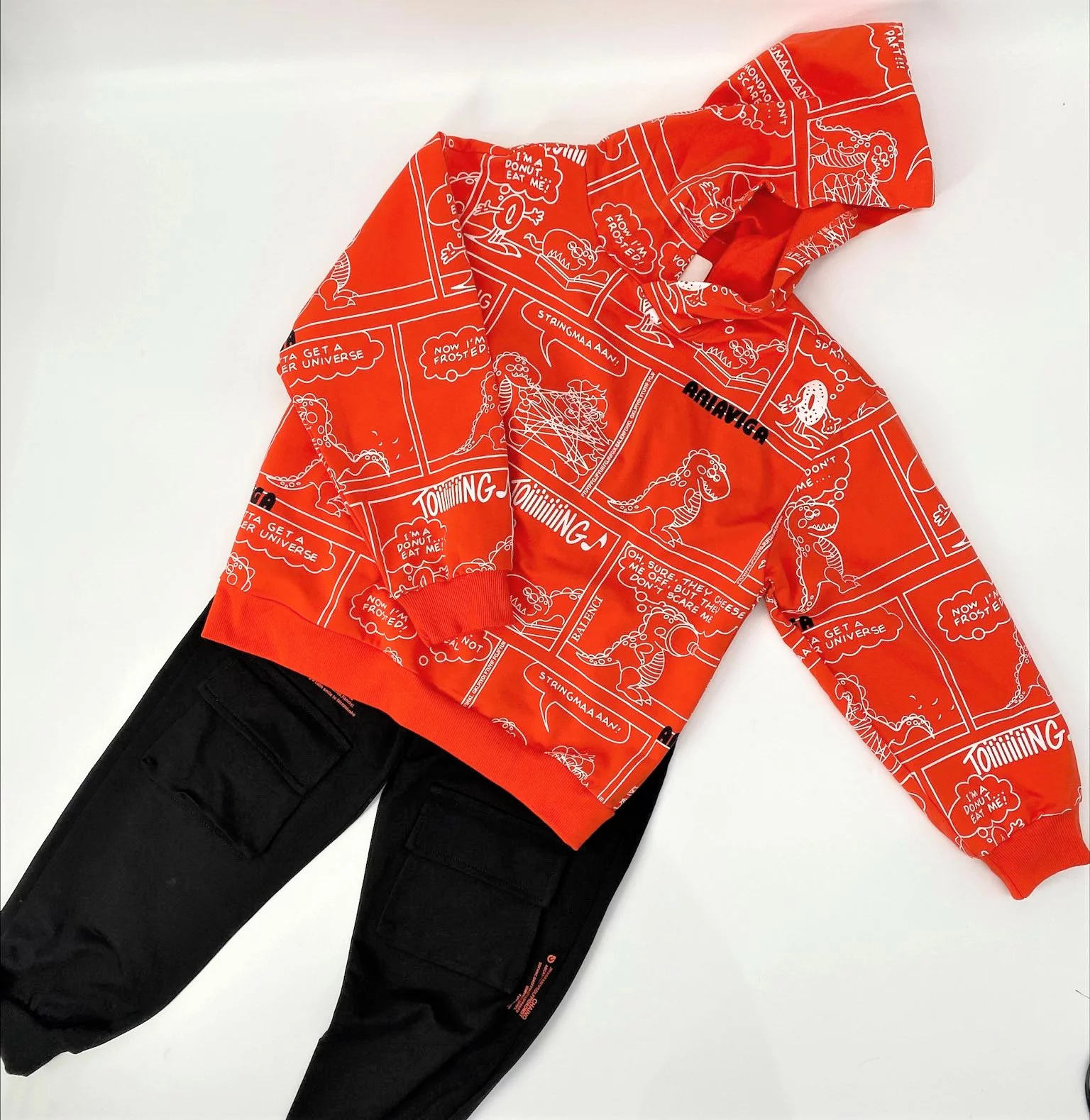 オレンジ×ブラックでカッコイイ!コミック柄風キッズ恐竜セットアップ