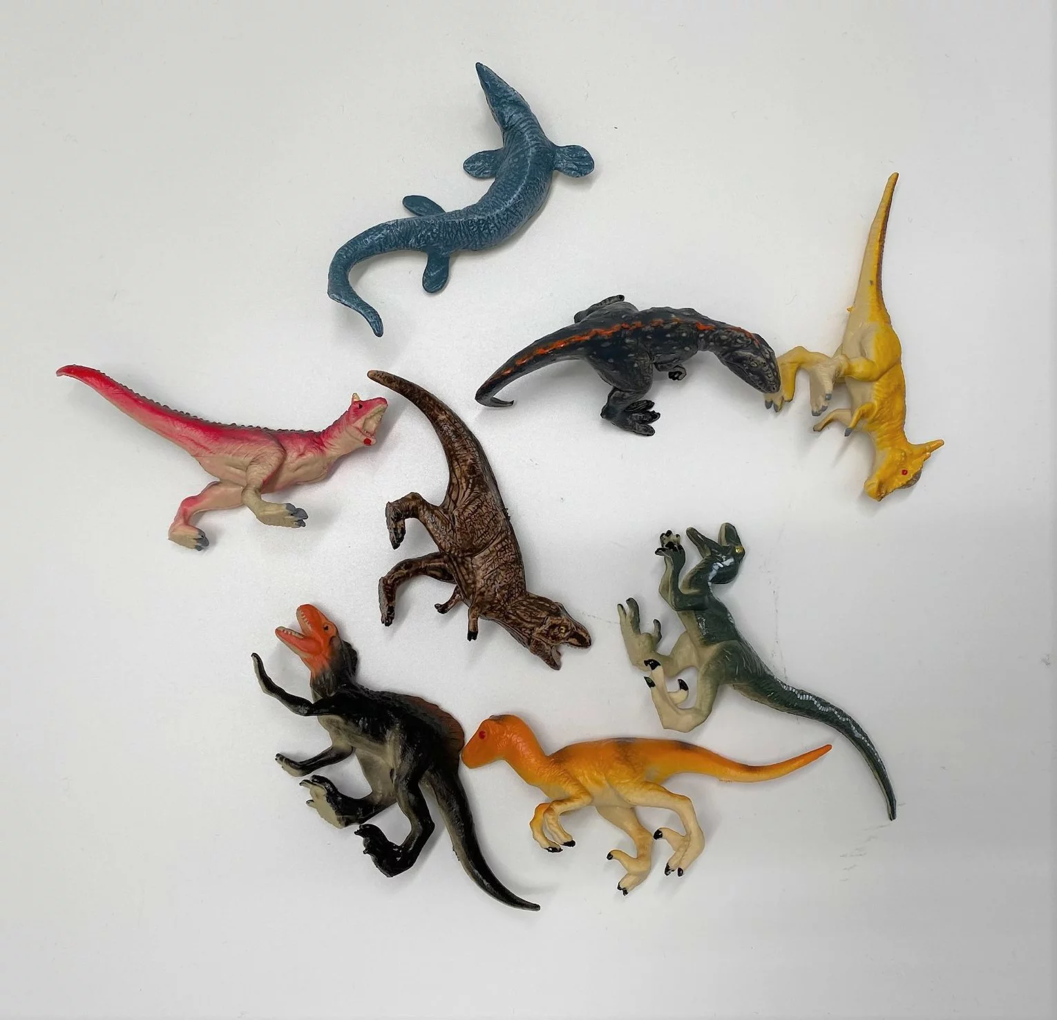 人気のティラノサウルス・ギガノトサウルス・スピノサウルス・パキケファロサウルス・カルノタウルス・モササウルス・ヴェロキラプトルが手のひらサイズのミニフィギュアになった8体セットです。