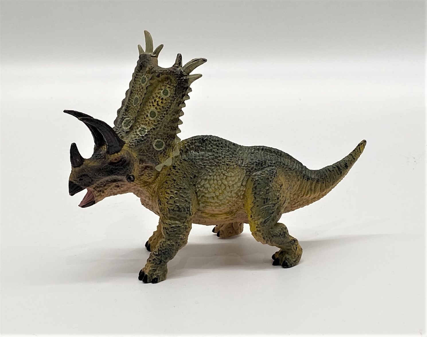 全身のそろった完全な骨格が数体発見されていて、かなり研究のすすんだ恐竜で、大きな群れで暮らしていた事などが分かっています。また、頭部の大きな角は肉食恐竜の攻撃を妨げる以外にも相手の腹部へ攻撃を行い、大きなダメージを与える「武器」として使っていたようです。