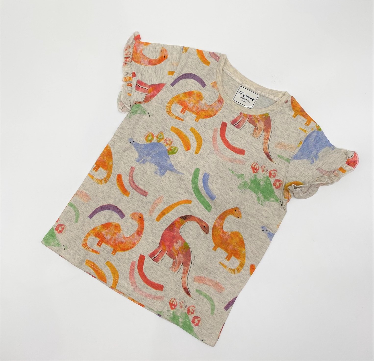 ・くすみカラーのTシャツにカラフルな恐竜がプリントされた女の子用恐竜Tシャツ