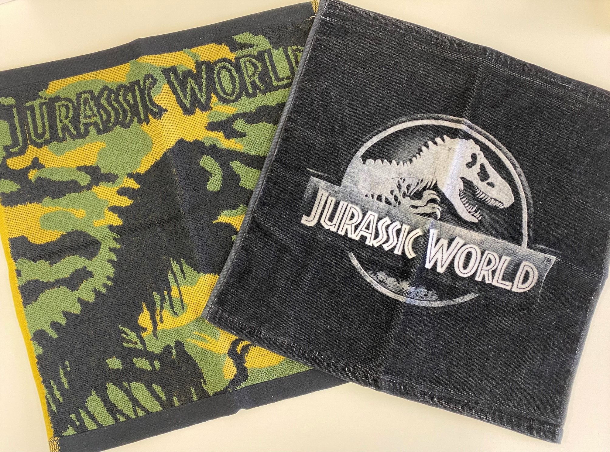 大人気映画『ジュラシックワールド』オフィシャルグッズのハンドタオルは、ブラックとカモフラージュ柄をご用意。吸水性バッチリで肌触りが気持ちいい♪ブラックはふかふかで気持ちいい【ウォッシュタオル】、カモフラージュはジャガードタイプとなっております。