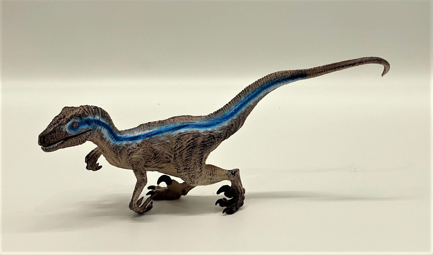 映画『ジュラシックパーク』で有名になったブルーのヴェロキラプトルは、映画仕様の見た目、デザインです。かぎ爪が特徴。