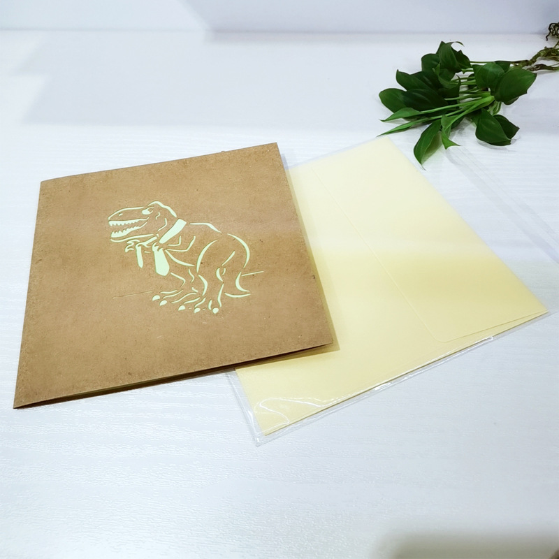 開くとびっくり!!ティラノサウルスの親子が飛び出す、3Dメッセージカード。ネクタイをして、バッグを持ったサラリーマン風のティラノサウルスがカワイイ(^^♪