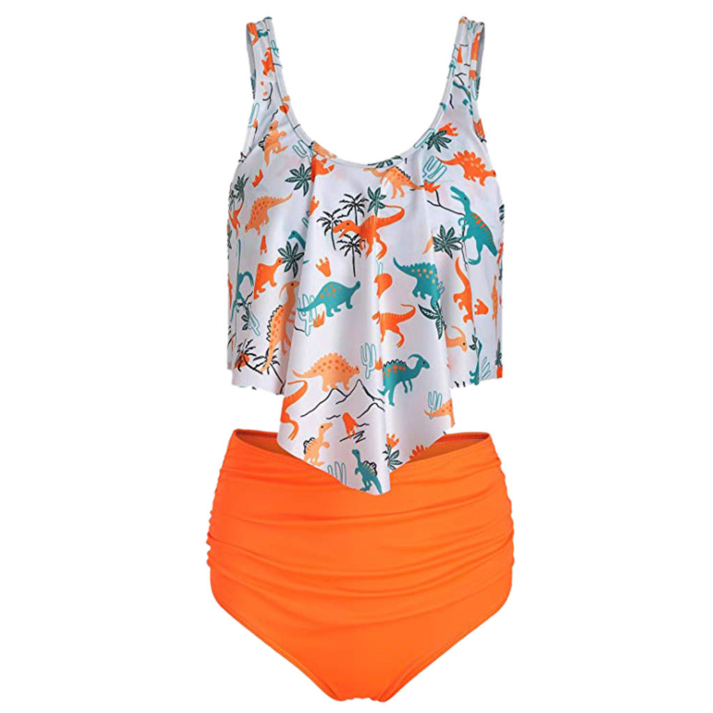 気持ちも明るくなるビビッドなオレンジとフリルが大人カワイイ♪な水着です。セパレートタイプなのでお着替えもラク♪かわいいイラストになったステゴサウルス・パラサウロロフス・ティラノサウルスと一緒に海や川・プールで水遊びを楽しんでください!恐竜好き家族のママ、恐竜大好き女子も原色・ネオンカラー好きにもおススメしたいカワイイ♪度が爆上がりの1枚です♪