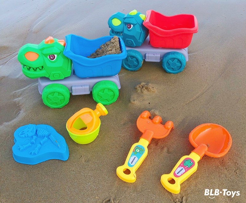 恐竜のお砂場5点セットはティラノサウルスのトラック、荷台、スコップ、熊手、型、じょうろです。カラーはブルー、レッドをご用意しております。オールシーズン、特にこの夏、公園や海、ビーチなどで大活躍!