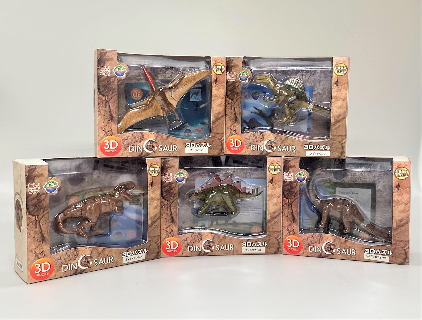 定番のティラノサウルス・ステゴサウルス・プテラノドン・スピノサウルスと、体の半分が首といわれるほど首の長い海生爬虫類タニストロフェウスが3D立体パズルになって登場!パーツを1つずつ組み立てていくと恐竜が出現!子どもでも簡単に進められるから(小さな部品の取り扱いには気を付けてください。)ぜひ親子で楽しんでみて!インテリアや贈り物にもgood!