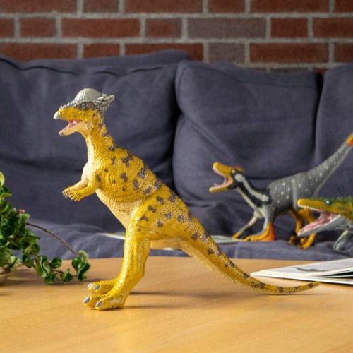 白亜紀後期にアメリカで生息していた、植物食でドーム状の頭の骨を持ち(頭頂部の骨は約25センチほどの厚みがあった)皿のような頭とクチバシのような口の形がカッパみたいな(?)パキケファロサウルスがビッグサイズのソフトビニールフィギュアになりました!