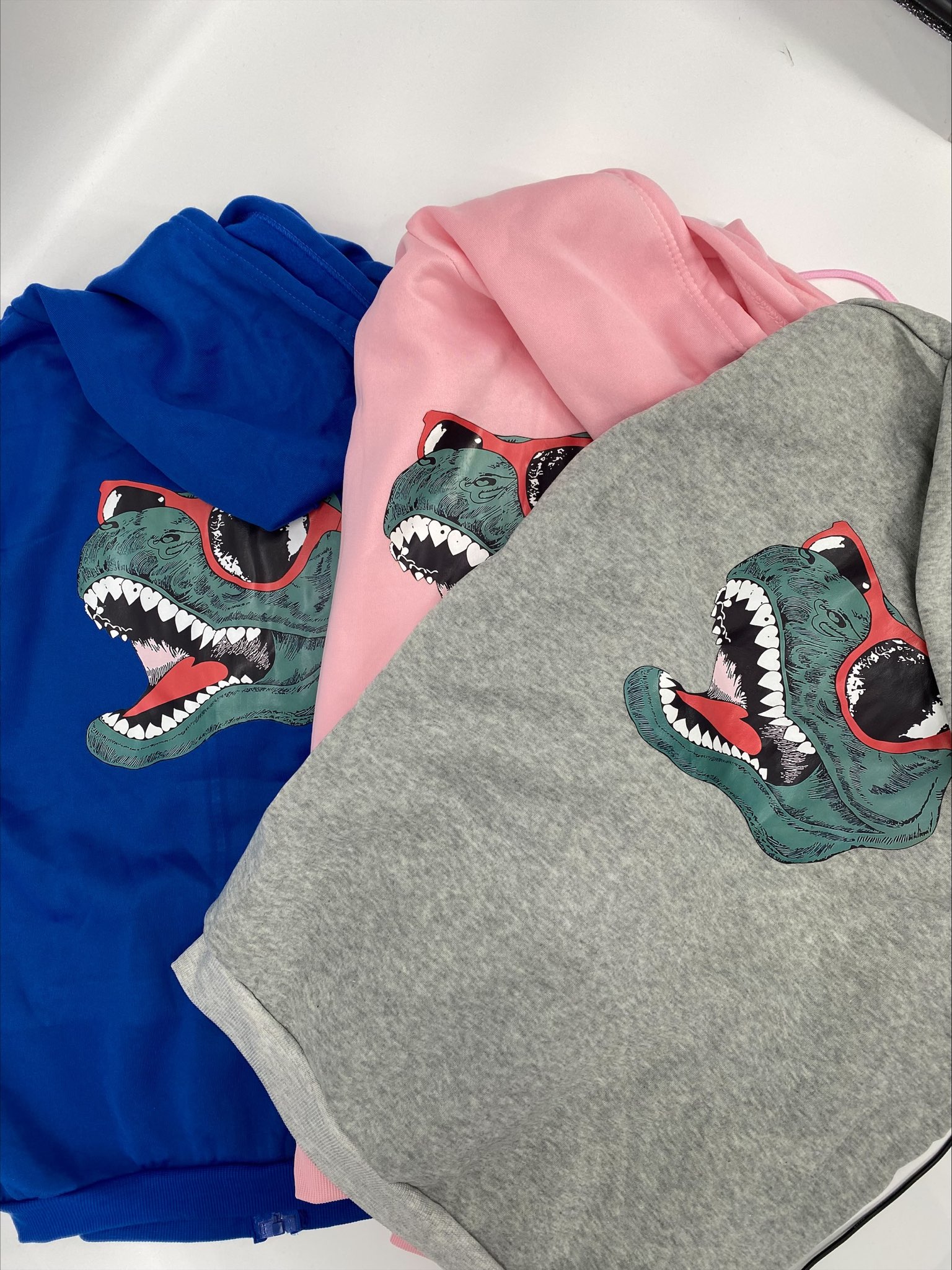 「オレはティラノサウルス!恐竜といえば俺のこと!」とラップを歌いだしそうな恐竜ちゃんのアメコミ風バックプリントが目を引くオーバーサイズフルジップパーカー!裏起毛なので寒い日のお出かけやスポーツに!部屋着としても着られます。