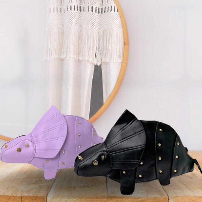 トリケラトプスのかわいらしいフォルムに、角や胴体にはスタッズもついてかっこよさもプラス!チェーンショルダーで高級感もあります。