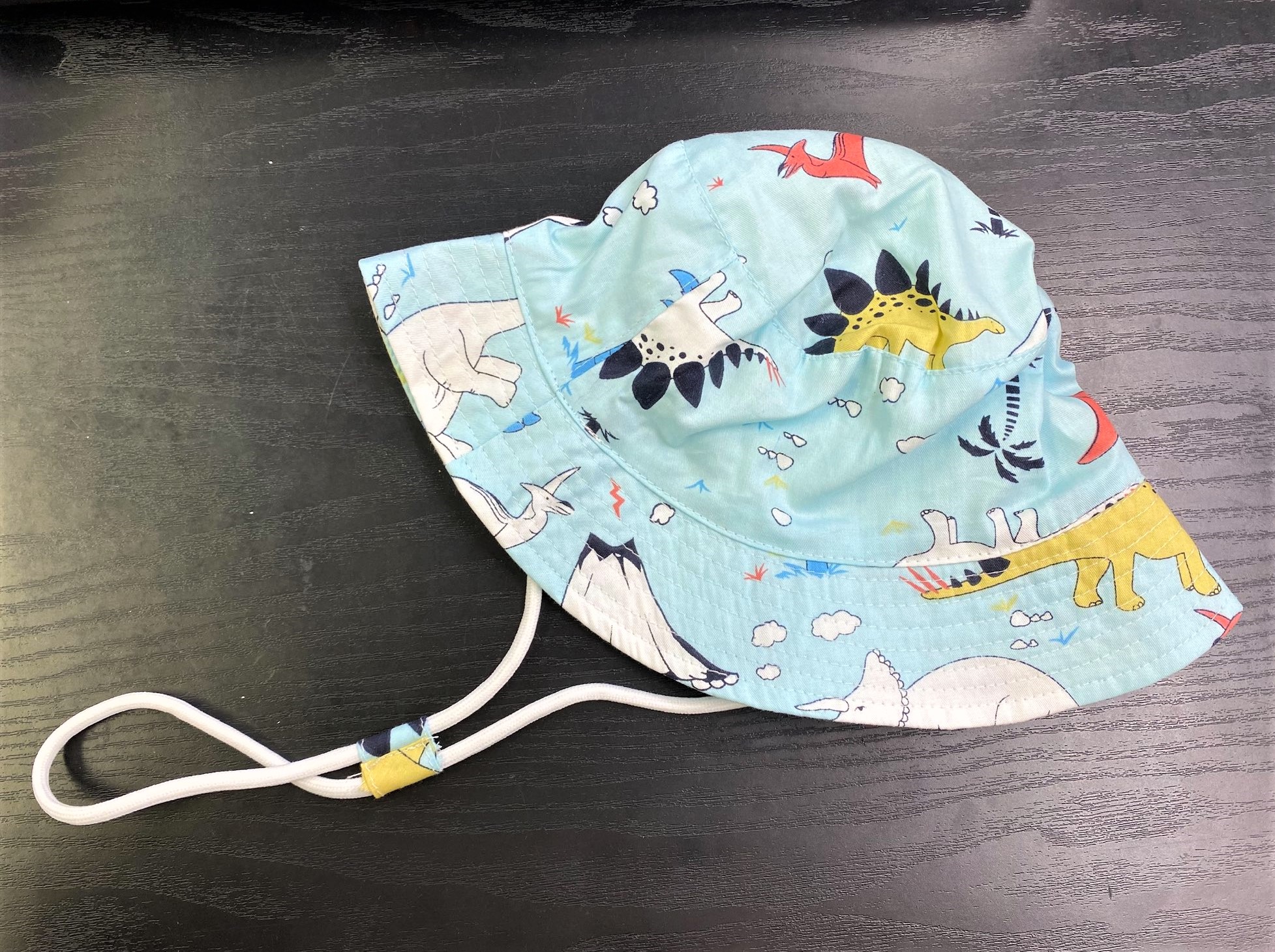 いろんな色のかわいらしい恐竜たちが描かれた生地の、カラフルでもやわらかい雰囲気の帽子です!