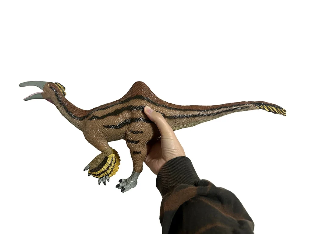 デイノケイルスの特徴であるカモのようなくちばし、ラクダのような背中、巨大な腕というユニークな姿を全長50㎝のビッグサイズで再現☆