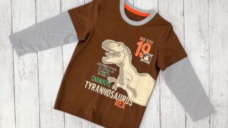恐竜ファンのお子様がいる親御さんにおススメする商品です!シンプルながらも、前後に違う柄の恐竜がプリントされていて、カジュアルでカッコイイTシャツです♪スポーツをしている恐竜がとっても可愛く、バッグプリントの恐竜は特に印象に残ります♪兄弟でお...