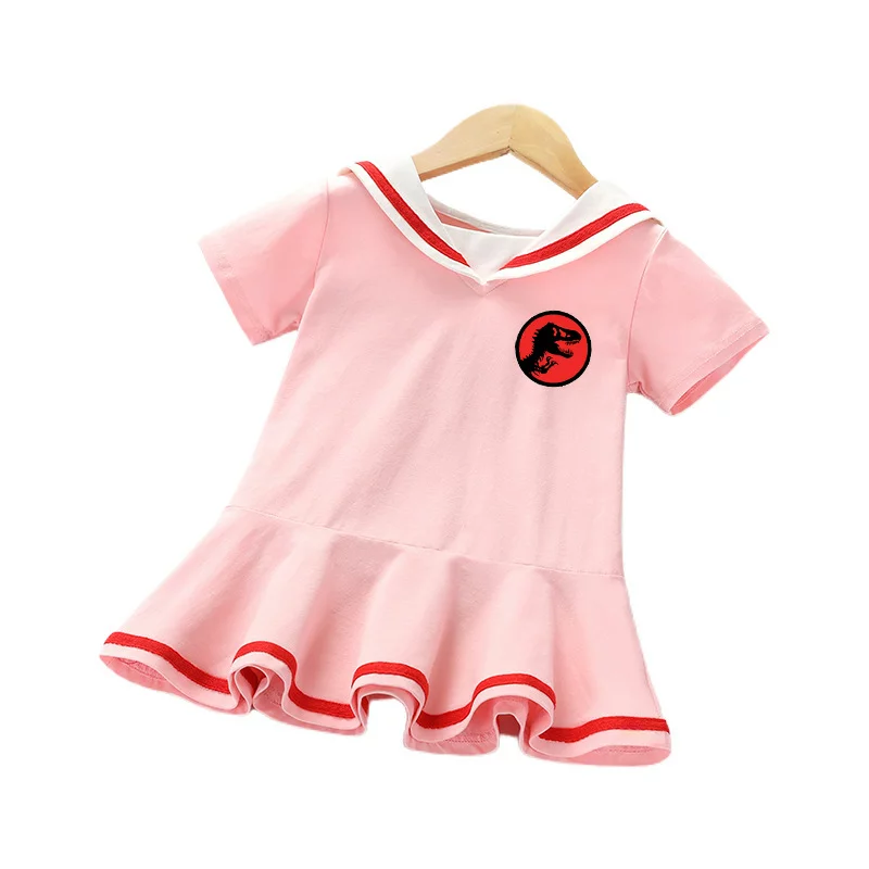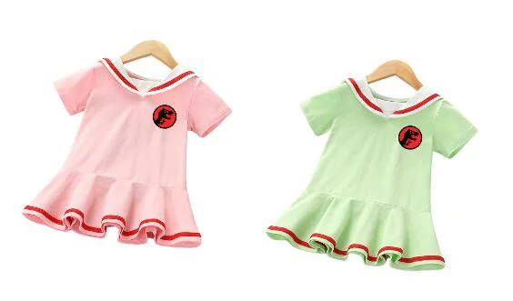 かわいらしいピンクとさわやかなグリーンの2色展開で、ジュラシックワールド風マークがついたセーラーワンピース。