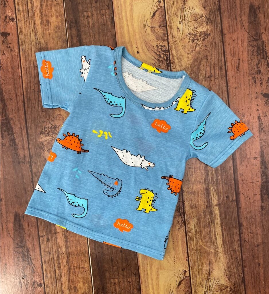 青空や海を思わせるような水色に3種類のゆるかわいくデフォルメされた恐竜ちゃんたちがデザインされたパジャマです。