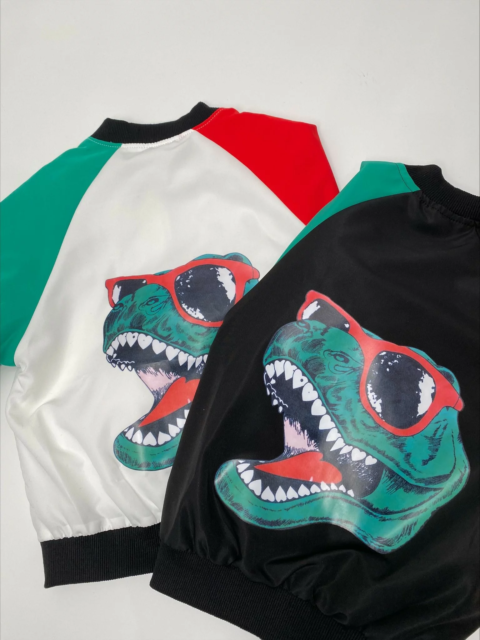 インパクト大のサングラスをかけたアメコミ風の恐竜のイラストと、赤と緑の袖のカラーリングがかっこいいキッズ用スプリングブルゾン。