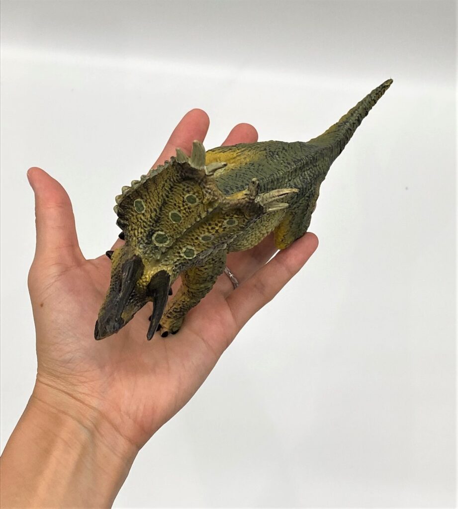 全身のそろった完全な骨格が数体発見されていて、かなり研究のすすんだ恐竜で、大きな群れで暮らしていた事などが分かっています。また、頭部の大きな角は肉食恐竜の攻撃を妨げる以外にも相手の腹部へ攻撃を行い、大きなダメージを与える「武器」として使っていたようです。