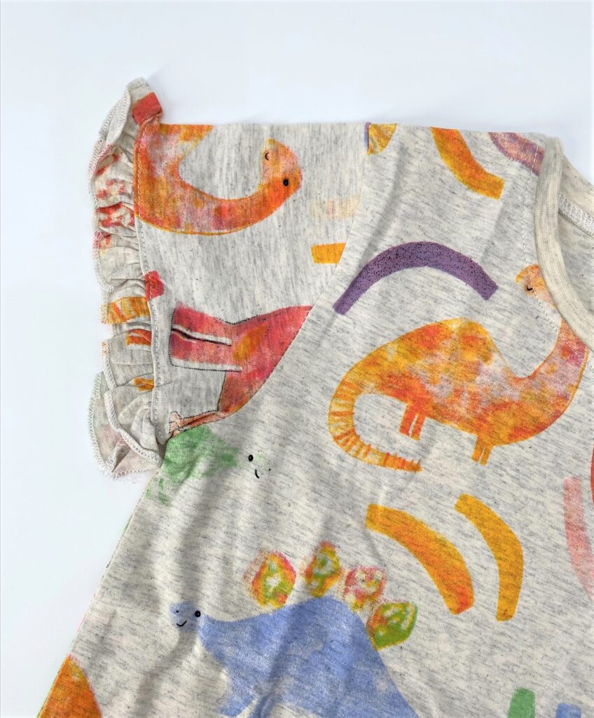 恐竜が大好きな女の子に最適な商品が登場しました♪グレーのTシャツに、カラフルでキュートな恐竜たちがプリントされていて、とってもカワイイ♪恐竜女子にはたまらない一品となっています!そして、袖がフリルになっているのが可愛さを更に引き立たせています♪カジュアルでシンプルなデザインが、どのボトムスとも合うTシャツになっています!手に入れると、今年の夏大活躍すること間違いなしです!恐竜好きなお子様や、お孫さんへのプレゼントにピッタリです♪
