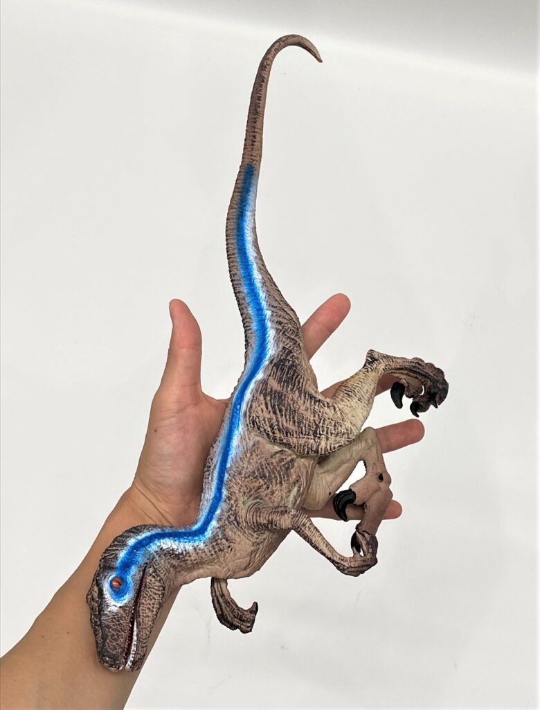 映画『ジュラシックパーク』で有名になったブルーのヴェロキラプトルは、映画仕様の見た目、デザインです。かぎ爪が特徴。