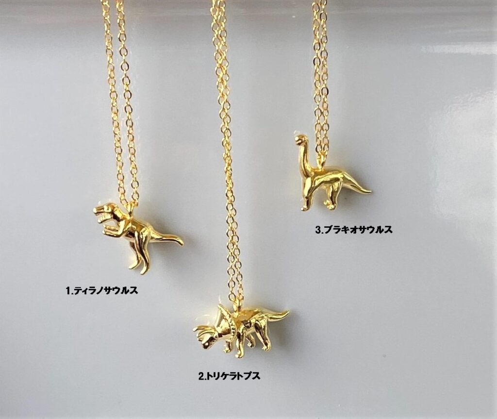 ティラノサウルス・トリケラトプス・ブラキオサウルスが気品あふれるシンプルなゴールドカラーのペンダントになりました!