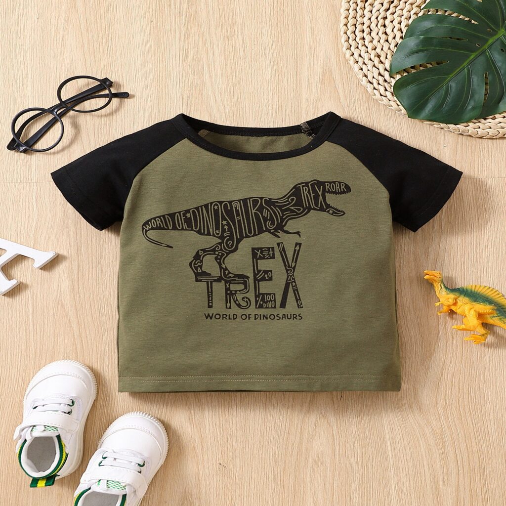 シックなグリーンのカラーと、胸元に目立つティラノサウルスは、星や矢印などの文字や記号が描かれていて超クール!カッコイイデザインのお洋服を好むお子様にピッタリの商品です♪
