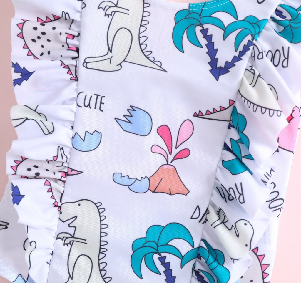 カラフルな恐竜や火山などが可愛く描かれていて、それだけでも可愛いですが、フリルも付いていて更に可愛さがアップした女の子用水着になっています♪ワンピースタイプでとても着やすいデザインなのが、親御さんも嬉しいポイント♪