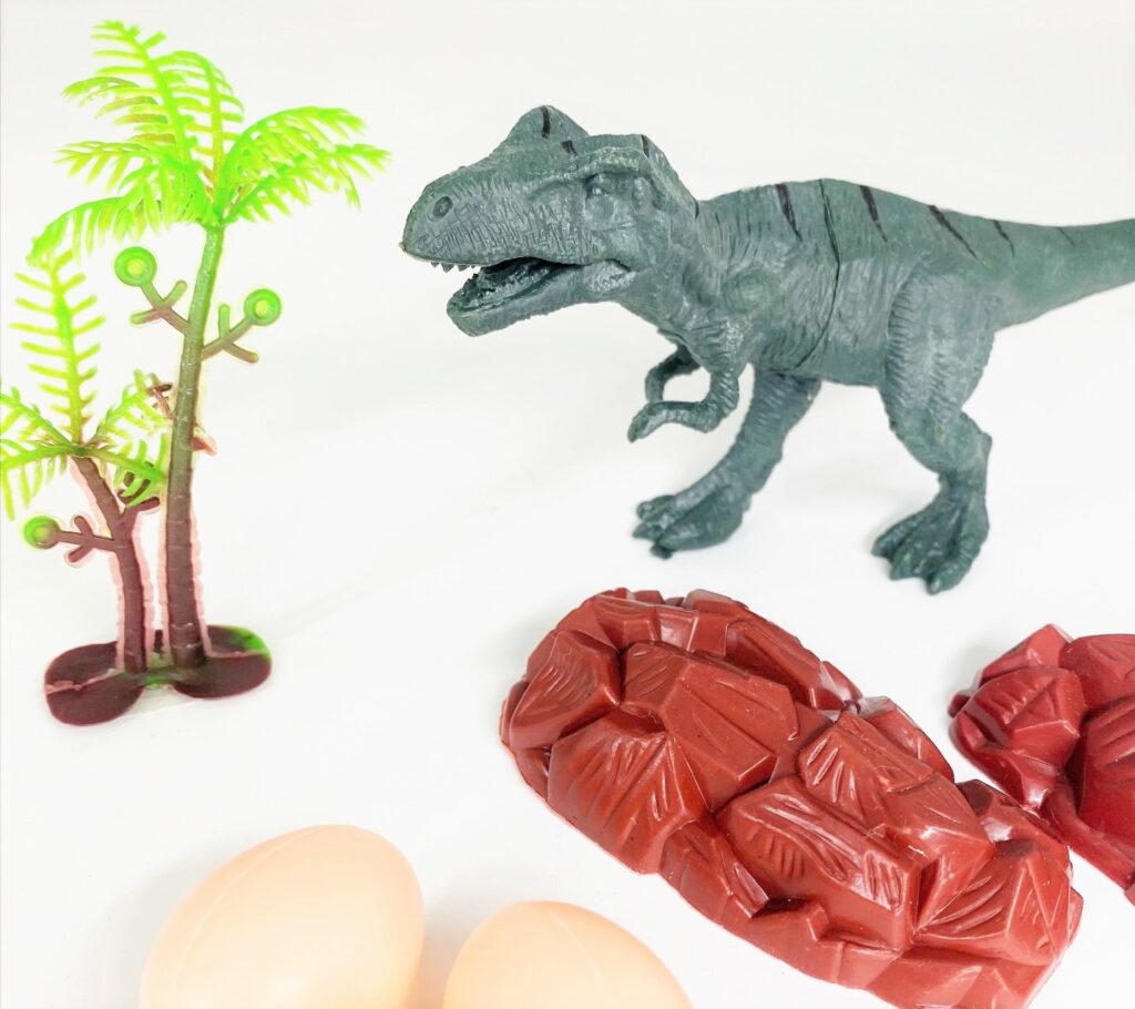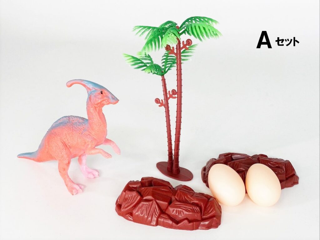 恐竜2体に木(大サイズ)1本、岩2個、たまご(A、Bは2個 C~Hは3個)のセットになっていて、ちょっとした恐竜世界が作れちゃいます。