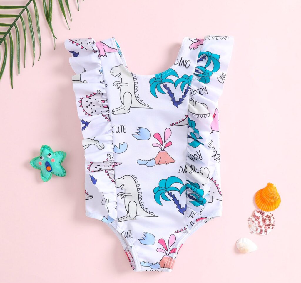 様々な恐竜が描かれているだけではなく、火山なども描かれているのがカワイイポイント♪フリフリが付いていているので、華やかに見えます♪ワンピースタイプなので、着るのもらくらく♪残暑のプール遊びにも持ってこい!温水プールで遊べる場所でも大活躍しますよ♪