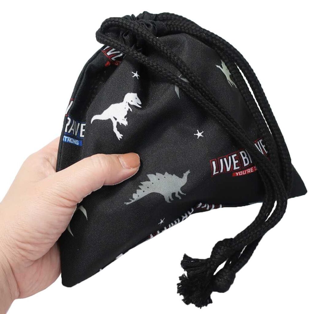 こちらの商品は特に小学生や幼稚園の男の子向け、ブラックのかっこいい恐竜デザインの巾着になります。