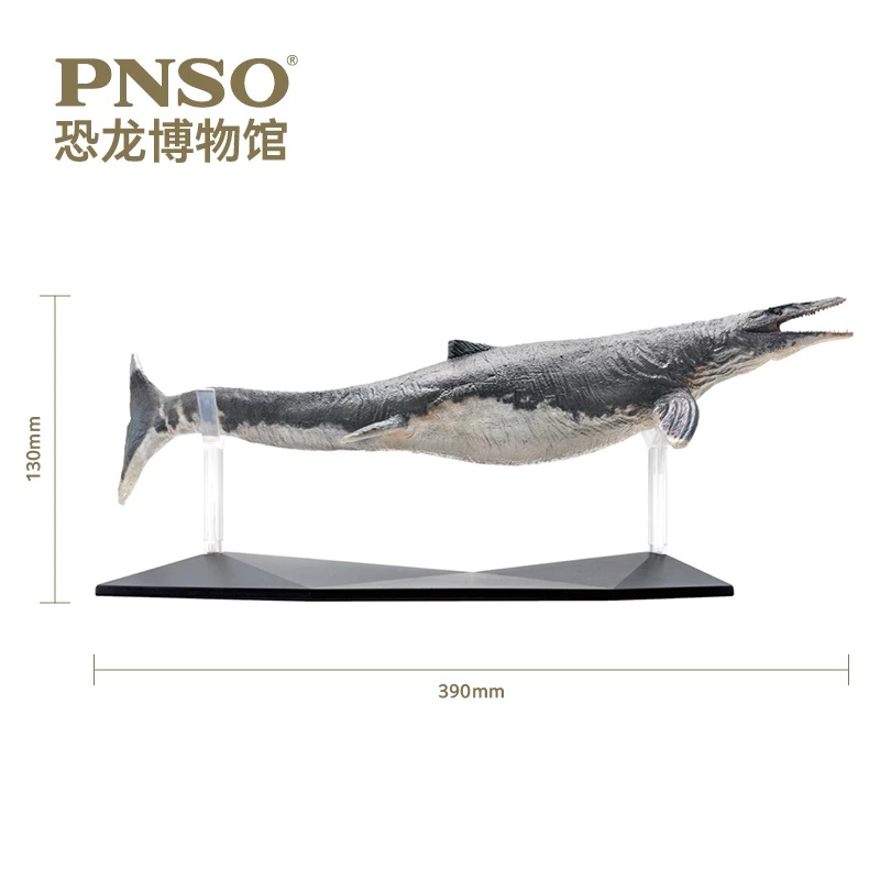 丸い筒状の胴体にワニのように先端が細くなった頭部、水の中を速く力強く泳ぐための長くて平らなしっぽと自在に泳ぐためのヒレ状の手足と獲物を切り刻むための鋭い歯。白亜紀後期の海の覇者として、時には激しい争いで傷を受けることもあったというモササウルスの特徴を35分の1のスケールに再現しました!
