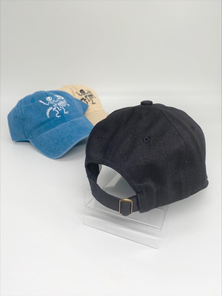 ・恐竜のスケルトン 、スカルナイトの刺繍の入ったキャップ。