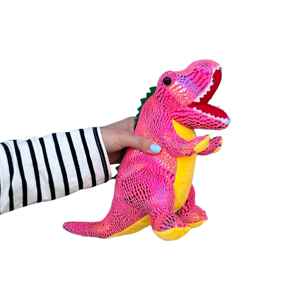 ラメ入りでキラキラ輝く、存在感抜群のティラノサウルスぬいぐるみ。